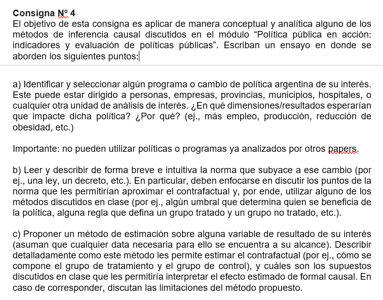En este curso se realiza una revisión general de herramientas econométricas utilizadas en la evaluación de políticas públicas (clases en Zoom) y se discuten aplicaciones de papers recientes que buscan estimar el impacto causal de diferentes políticas (clases presenciales).